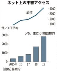 IoT機器が家庭やオフィスに浸透する中、サイバー攻撃の脅威は増している。ウェブカメラなどを標的とし、2016年に世界規模で猛威を振るったウイルス「Mirai(ミライ)」はその後も亜種の活動活発化が断続的に確認されている。警察庁の観測では、主にIoT機器を狙ったとみられるネット上の不審アクセスは19年に1日平均2844.8件(全体の約68%)で、15年から約8倍に増えた。