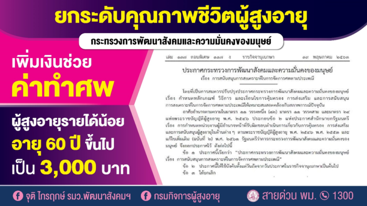 กระทรวงการพัฒนาสังคมและความมั่นคงของมนุษย์ (พม.) ได้ออกประกาศฉบับใหม่ เรื่อง “เงินจัดการศพผู้สูงอายุตามประเพณี” ซึ่งมีผลบังคับใช้เมื่อวันที่ 20 พฤษภาคมที่ผ่านมา โดยนางสุจิตรา พิทยานรเศรษฐ์ อธิบดีกรมกิจการผู้สูงอายุ (ผส.) เปิดเผยว่า เงินจัดการศพผู้สูงอายุ ปรับปรุงใหม่ จากเดิมให้ 2,000 บาทต่อศพ เพิ่มเป็น 3,000 บาทต่อศพ และยืดวันยื่นขอหลังออกใบมรณบัตรจาก 30 วัน เป็น 6 เดือน