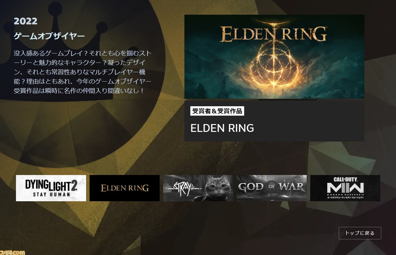 からの記事と詳細 ( 『エルデンリング』がSteamアワードの今年度ゲーム・オブ・ザ・イヤー(年間最優秀ゲーム)に選出 - ファミ通.com )
